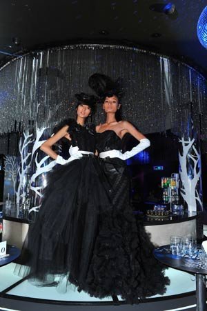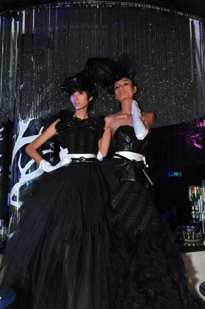 Hoàng Thùy, Lê Thúy - hai tiểu thư quyến rũ với "cây đen". Chiếc mũ quý tộc và đầm dạ hội mang phong cách châu Âu với chất liệu ren, voan sang trọng. Kiêu kỳ
