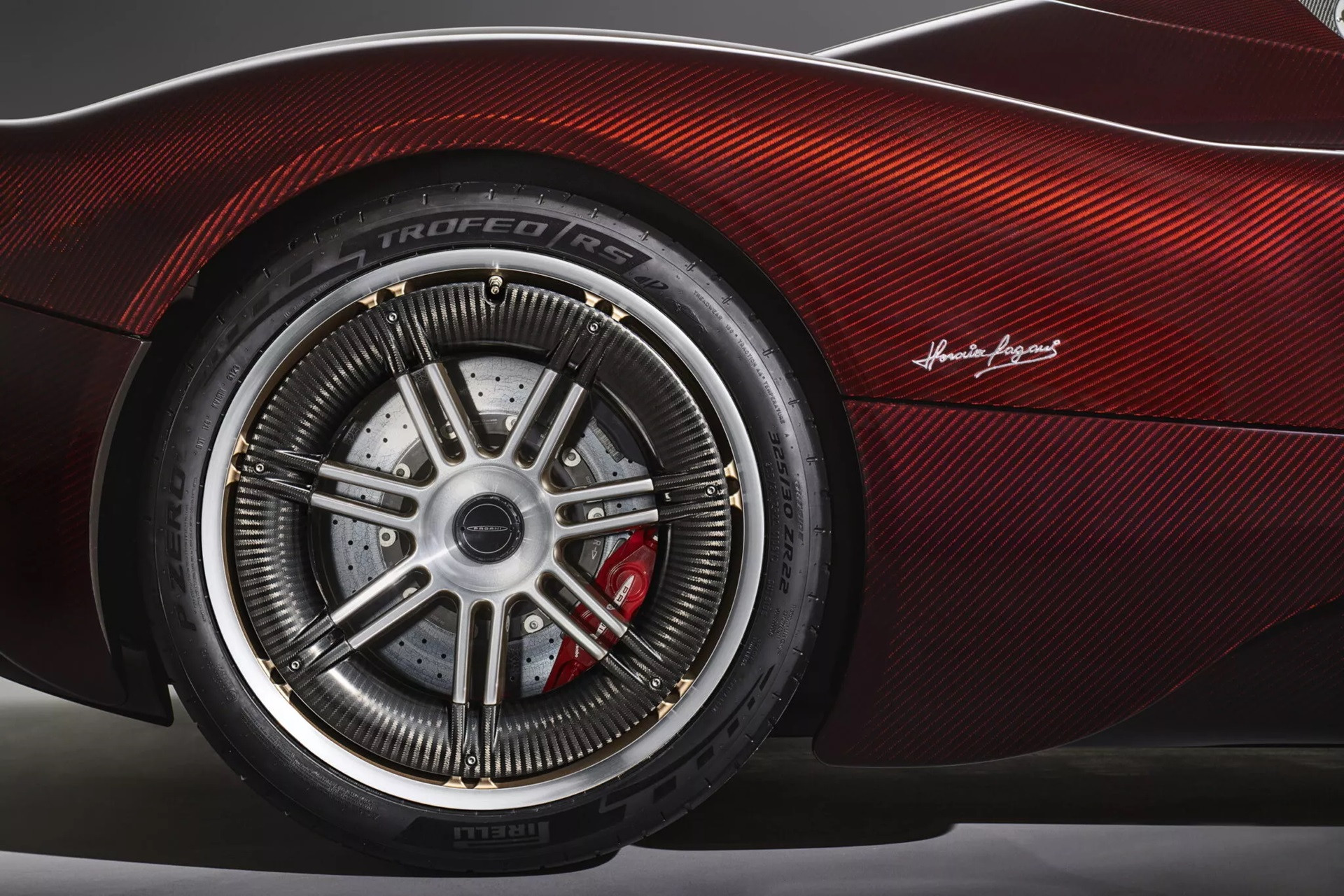 Pagani cung cấp nhiều tùy chọn cá nhân hóa cho khách hàng mua Utopia Roadster, bao gồm cả cấu hình Sport Pack trên biến thể mui cứng (Coupe). Chiếc xe trưng bày đi kèm gói này nhưng đặc biệt hơn nhờ ngoại thất hoàn thiện từ chất liệu carbon màu đỏ Habanero Red, kết hợp với bộ mâm carbon Aeroblade.