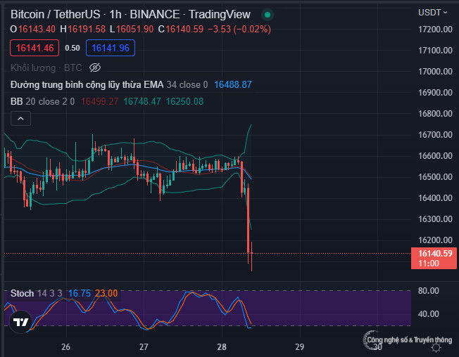 Ghi nhận của VietNamNet cho thấy, trong 2 giờ qua, giá Bitcoin đã giảm một mạch 500 USD với sự xuất hiện của cây nến Marubozo màu đỏ trong khung 1 giờ. Theo đó, từ mức giá 16.500 USD, giá Bitcoin có lúc tụt xuống sát mức 16.000 USD.