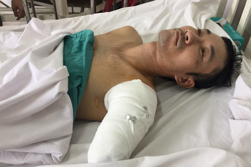 Phần tay trái của anh Hiệp bị tổn thương sâu, bác sĩ đã điều trị tích cực, rạch giải áp cứu cánh tay tuy nhiên không giữ được.