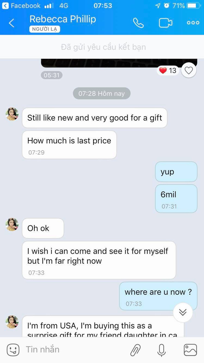 Một đoạn tin nhắn được chia sẻ trên Group Tinh Tế (Facebook) cho thấy kẻ lừa đảo đang cố đặt vấn đề không thể gặp trực tiếp, cố gắng moi thêm thông tin cá nhân của con mồi.