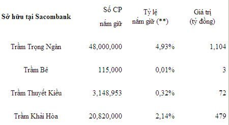 Trong đó nắm giữ nhiều nhất là người con trai cả - Trầm Trọng Ngân - với 48 triệu cổ phiếu. Ông Bê chỉ nắm giữ vỏn vẹn 115 nghìn cổ phiếu. Ông Trầm Trọng Ngân đang ở vị trí thứ 14 và ông Trầm Khải Hòa ở vị trí thứ 37 trong top những người giàu nhất TTCK. Ông Trầm Bê chỉ xếp ở vị trí thứ 189.