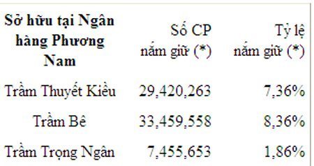 Trong đó, ông Bê là cổ đông cá nhân lớn nhất nắm 8,36% cổ phần. Hiện ông Trầm Trọng Ngân giữ chức vụ Phó Chủ tịch còn bà Trầm Thuyết Kiều là Phó TGĐ của Ngân hàng Phương Nam.