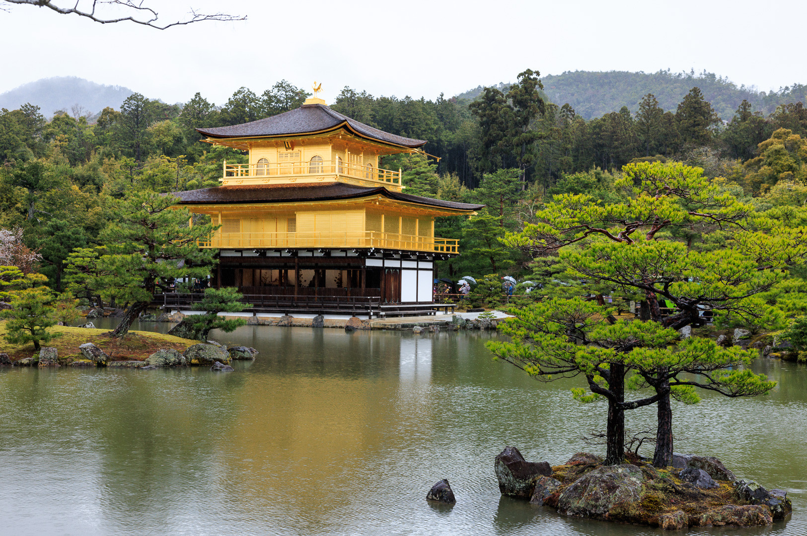 Kinkaku-ji còn gọi là 'chùa Gác Vàng', ban đầu là khu nghỉ dưỡng của tướng Ashikaga - tổng tư lệnh thời Muromachi (1336-1573). Sau khi ông qua đời, ngôi chùa được dát toàn vàng lá. Kinkaku (Gác Vàng) gồm ba tầng, chỉ là một trong nhiều kiến trúc trong khuôn viên chùa. Ngôi gác có ba tầng soi bóng xuống ao Kyoko-chi (ao Gương), xung quanh là những tán tùng tựa bức tranh thủy mặc.