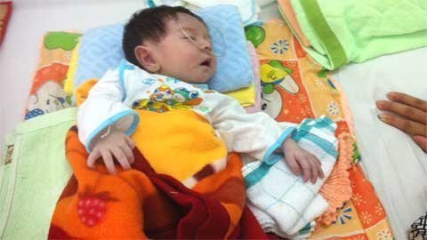 Khí quản bị dị dạng nên đường thở của bé luôn luôn gặp vấn đề, khóc không ra tiếng. Hơi thở khò khè nặng nhọc nên bé phải nằm trong phòng cấp cứu từ khi nhập viện.