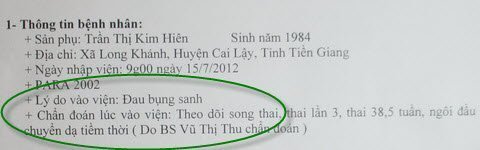 Sau khi nhập viện, vợ tôi được siêu âm tại bệnh viện và chính mắt tôi thấy kết quả song thai một nằm dọc, một nằm ngang. Nếu chỉ có một thai tại sao bác sĩ siêu âm không thông báo với tôi và gia đình. Lúc đó chúng tôi có 5 người nhưng không ai được thông báo. Tôi cũng không nhìn thấy dòng chữ kết hợp lâm sàng như trong thư đề cập.