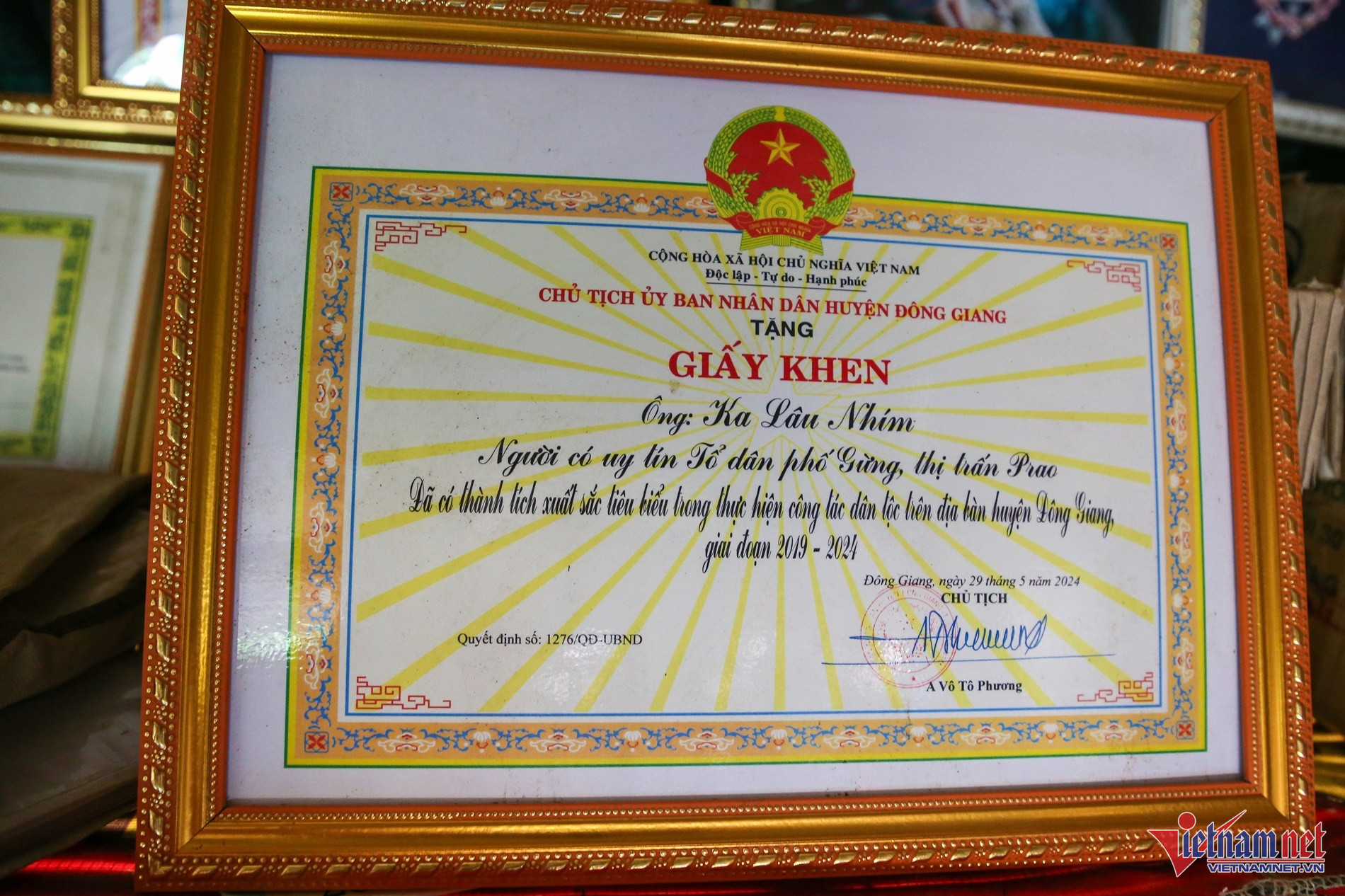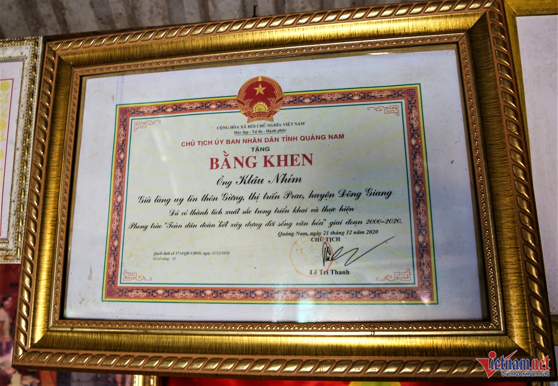 Trao đổi với PV VietNamNet, ông Nguyễn Đăng Trọng, cán bộ văn hóa thị trấn Prao cho biết, với sự gương mẫu và tâm huyết của mình, già làng C'lâu Nhím luôn được đồng bào Cơ Tu tin yêu và chính quyền địa phương ghi nhận với nhiều giấy khen.