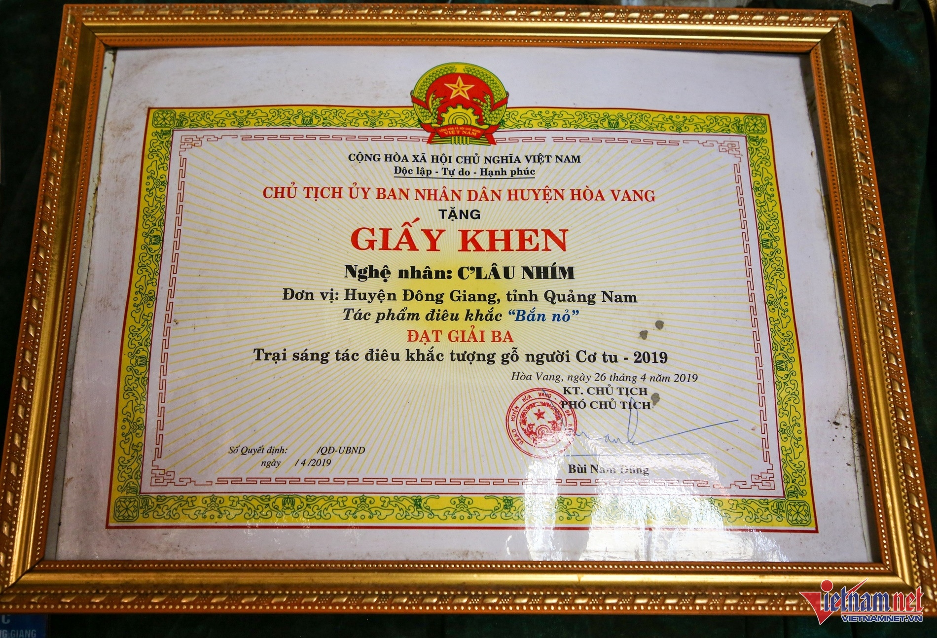 Là nghệ nhân điêu khắc tài hoa, già làng C'lâu Nhím từng giành giải 3 với tác phẩm bắn nỏ tại Trại sáng tác điêu khắc tượng gỗ người Cơ Tu năm 2019 do UBND huyện Hòa Vang (Đà Nẵng) tổ chức.
