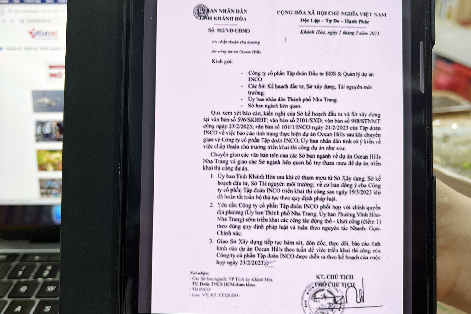 Văn bản giả ghi số 982 ngày 1/3/2023 của UBND tỉnh Khánh Hòa về việc chấp thuận chủ trương cho thi công dự án Ocean Hills, giả mạo chữ ký của Phó chủ tịch UBND tỉnh Khánh Hòa ông Đinh Văn Thiệu.