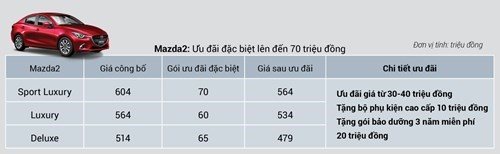 Ngoài CX-5 và CX-8, hầu hết các mẫu xe khác cũng đều được giảm giá tiếp theo các chương trình đã triển khai trước đó. Trong đó, CX-5 phom cũ đang được ưu đãi tới cả trăm triệu đồng (trong đó giảm 50 triệu đồng tiền mặt), Mazda2 giảm giá từ 30 – 40 triệu đồng tùy phiên bản; Mazda3 giảm 20 – 30 triệu đồng tùy phiên bản.