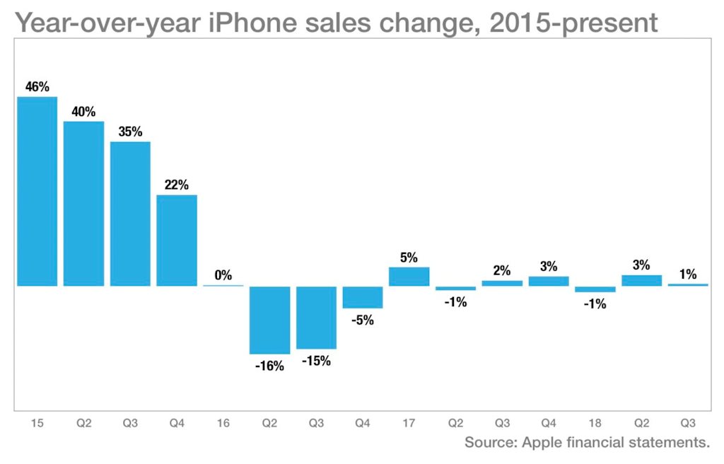 Tăng trưởng số lượng iPhone bán ra hàng năm khá thấp, trong khi doanh thu tăng lên. Ảnh: Macworld |