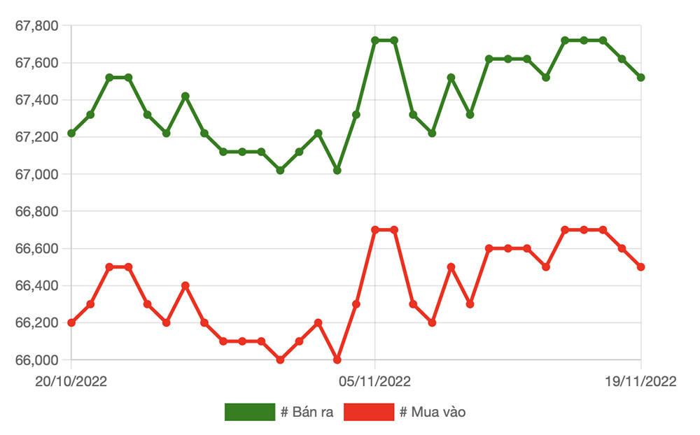 Kết thúc phiên 19/11, giá vàng miếng 9999 tại SJC TP.HCM là 66,5 triệu đồng/lượng (mua vào) - 67,5 triệu đồng/lượng (bán ra). SJC Hà Nội niêm yết ở mức 66,5 triệu đồng/lượng (mua vào) và 67,52 triệu đồng/lượng (bán ra).