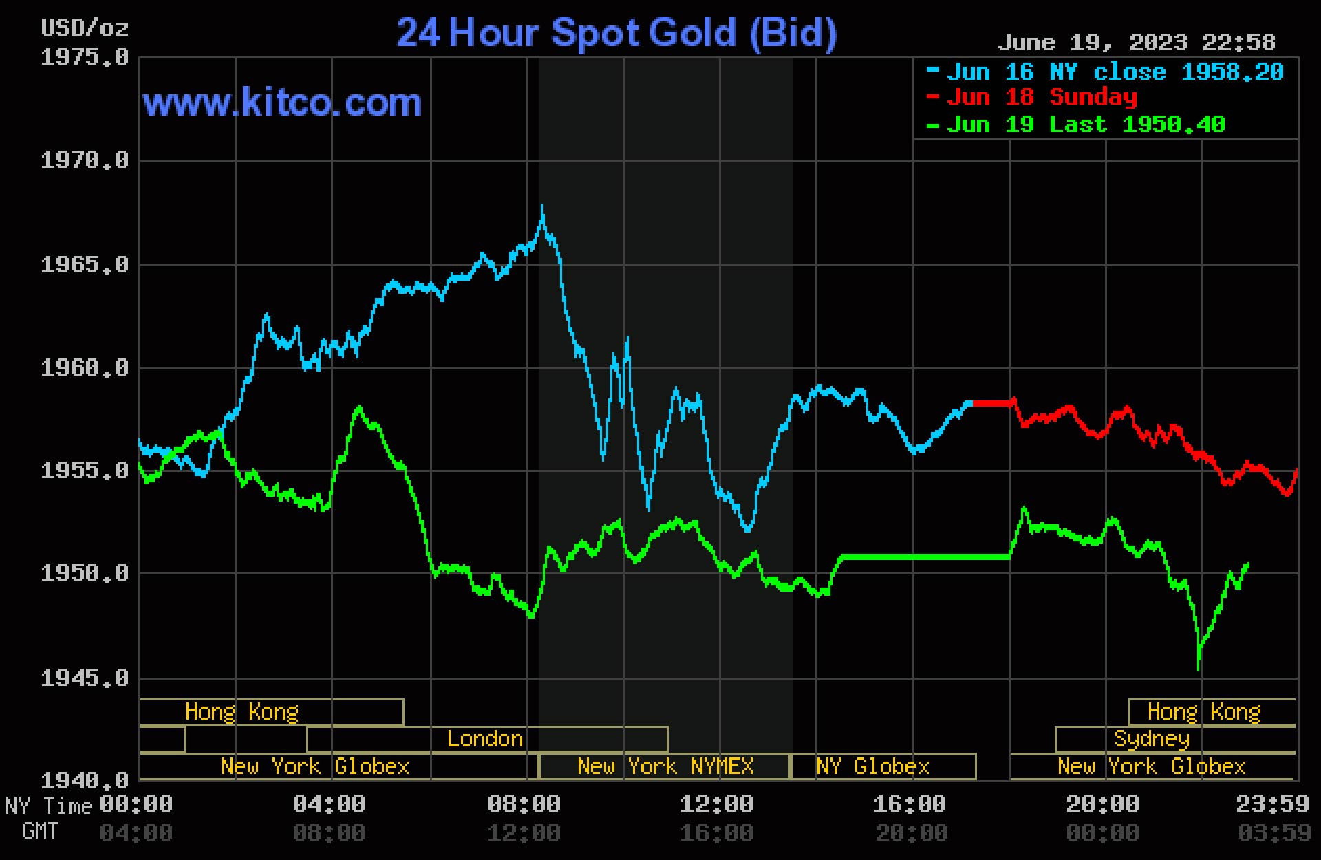 Trên thị trường thế giới, giá vàng giao ngay 19/6 (theo giờ Việt Nam) giao dịch ở mức 1.951 USD/ounce.