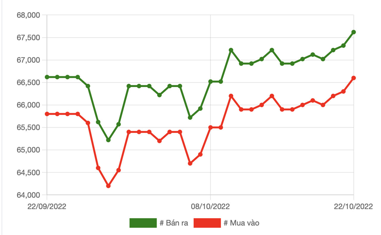 Kết thúc phiên 22/10, giá vàng miếng 9999 tại SJC TP.HCM là 66,3 triệu đồng/lượng (mua vào)- 67,3 triệu đồng/lượng (bán ra). SJC Hà Nội niêm yết ở mức 66,3 triệu đồng/lượng (mua vào) và 67,32 triệu đồng/lượng (bán ra).