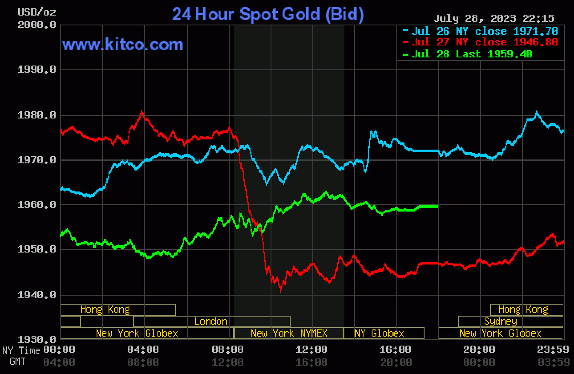 Trên thị trường thế giới, giá vàng giao ngay sàn Kitco 28/7 (lúc 20h, theo giờ Việt Nam) giao dịch ở mức 1.954 USD/ounce.