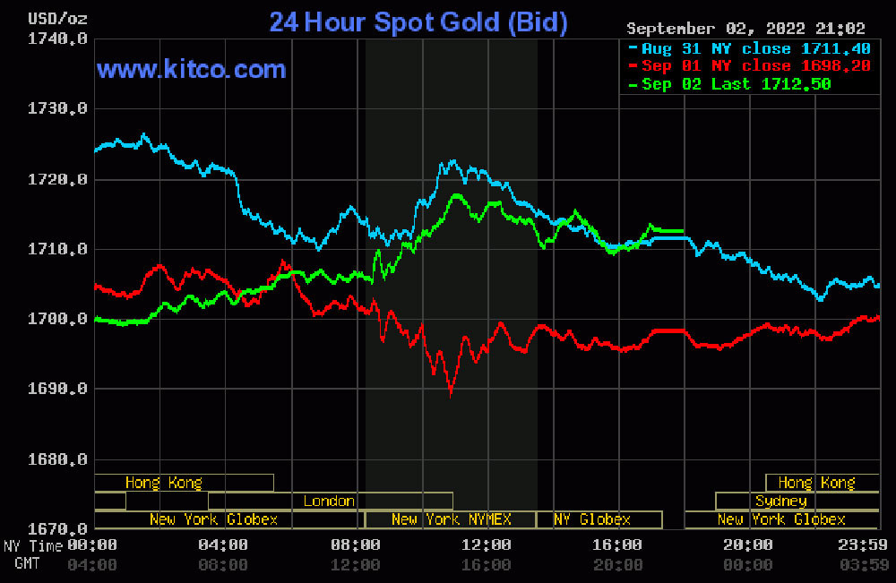 Tới 8h05' hôm nay (ngày 3/9, giờ Việt Nam), giá vàng thế giới giao ngay đứng quanh ngưỡng 1.712,5 USD/ounce, tăng 1,1 USD/ounce so với đêm qua. Giá vàng giao tương lai tháng 1/2023 trên sàn Comex New York ở mức 1.722,6 USD/ounce, tăng 5,7 USD/ounce so với đêm qua.