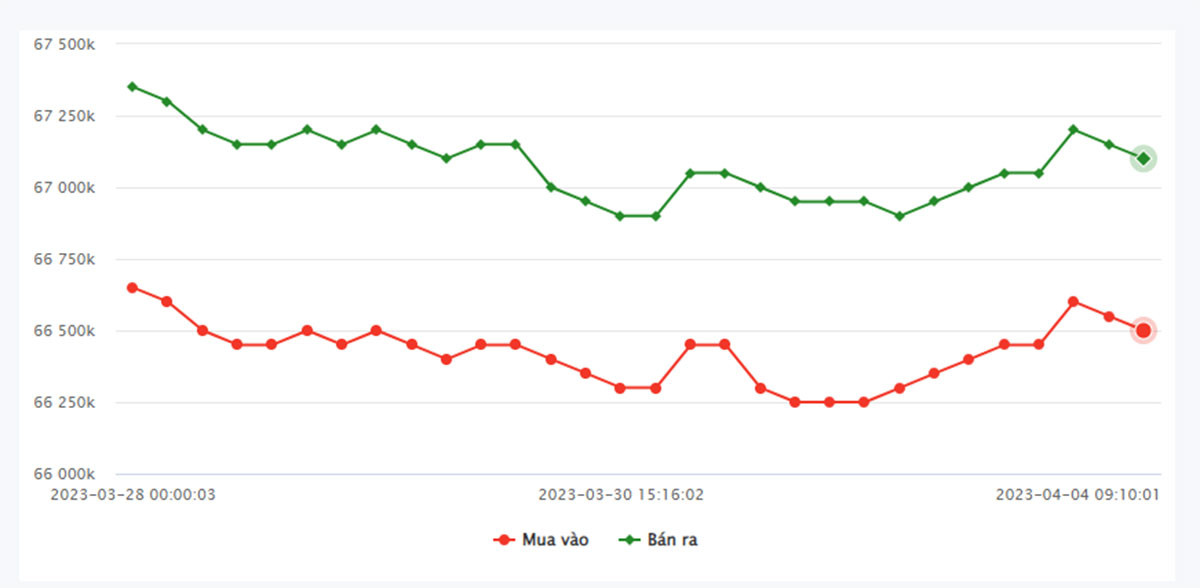 Chốt phiên giao dịch 3/4, giá vàng miếng 9999 tại SJC TP.HCM là 66,45 triệu đồng/lượng (mua vào) và 67,05 triệu đồng/lượng (bán ra). SJC Hà Nội niêm yết ở mức 66,45 triệu đồng/lượng (mua vào) và 67,07 triệu đồng/lượng (bán ra).