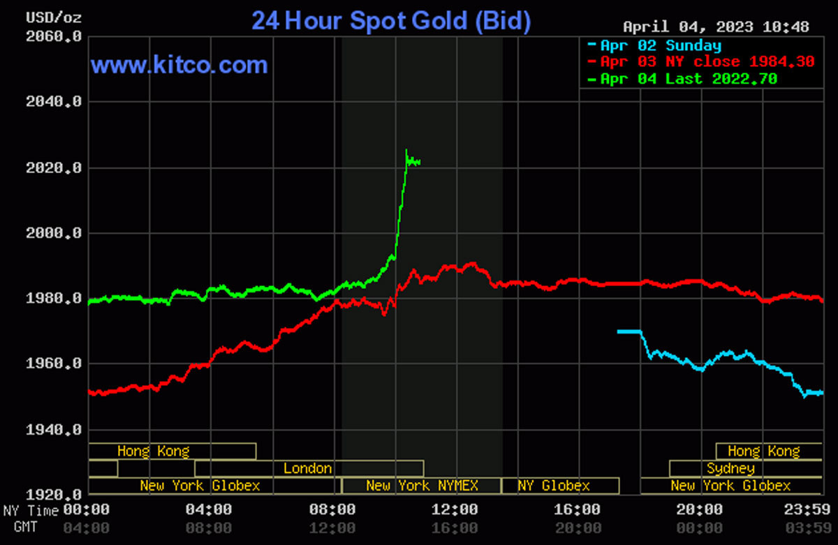Đêm 4/4 (giờ Việt Nam), giá vàng thế giới giao ngay tăng vọt thêm 40 USD vào đầu giờ giao dịch trên thị trường Mỹ, lên ngưỡng 2.021 USD/ounce. Vàng giao tháng 6 trên sàn Comex New York ở mức 2.025 USD/ounce.