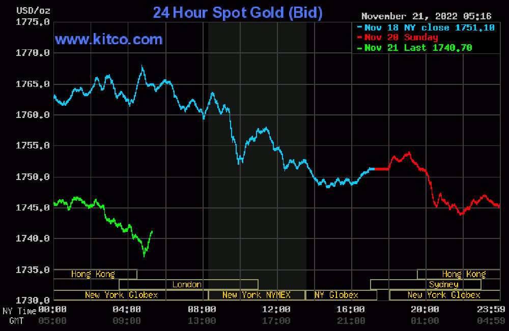 Trên thị trường thế giới, giá vàng hôm nay giảm khá mạnh. Vào lúc 17h06' ngày 21/11 (giờ Việt Nam), giá vàng giao ngay ở mốc 1.740 USD/ounce.