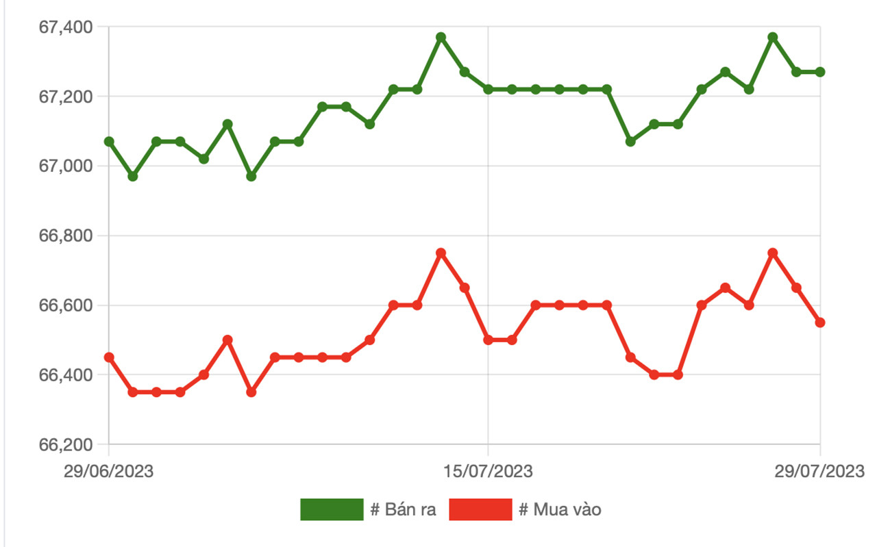 Phiên đầu tháng (1/7), giá vàng miếng 9999 tại SJC TP.HCM là 66,35 triệu đồng/lượng (mua vào) và 67,05 triệu đồng/lượng (bán ra). SJC Hà Nội niêm yết ở mức 66,35 triệu đồng/lượng (mua vào) và 67,07 triệu đồng/lượng (bán ra).