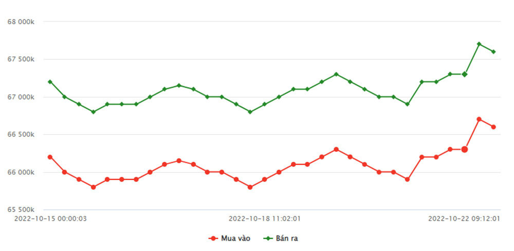 Cụ thể, mở cửa thị trường hôm nay (ngày 22/10), giá vàng miếng của SJC niêm yết tại thị trường Hà Nội ở mốc 66,6 triệu đồng/lượng (mua vào) và 67,62 triệu đồng/lượng (bán ra), tăng 300 nghìn đồng/lượng ở cả chiều mua vào và chiều bán ra so với kết thúc phiên giao dịch hôm qua.