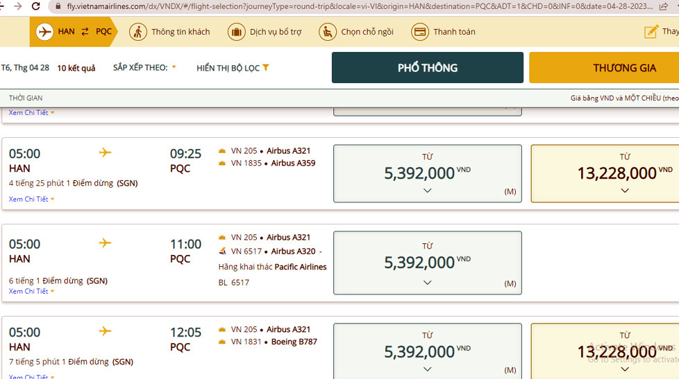Giá vé đắt nhất vẫn là các chuyến bay từ Hà Nội đi Phú Quốc, khi trung bình lên tới 7,5-8 triệu đồng/vé khứ hồi. Thậm chí, chiều đi trên chuyến bay của Vietnam Airlines đang hiển thị giá vé hạng thương gia lên tới 13,2 triệu đồng, đắt hơn cả đợt cao điểm Tết Nguyên đán 2023 khi vé từ TP.HCM ra Hà Nội trên 10 triệu đồng/chặng.