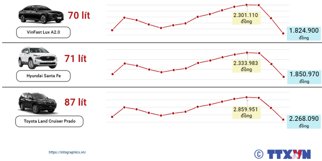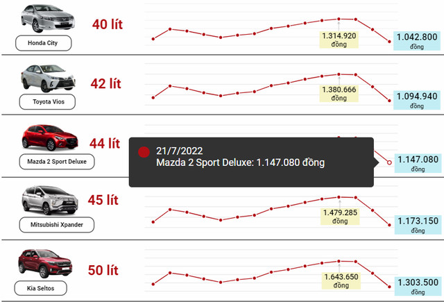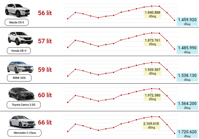 Biểu đồ sau thể hiện số tiền cần để đổ đầy bình xăng cho các dòng xe.