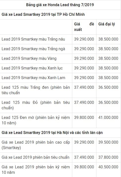 Dưới đây là bảng thống kê chi tiết giá xe Honda Lead 2019 để bạn đọc tham khảo!