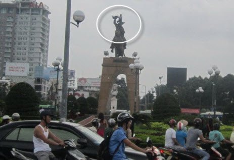 người có mặt trong khuôn viên tượng đài và xe cộ lưu thông quanh vòng xoay, gây