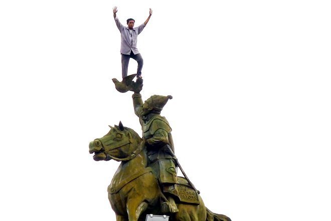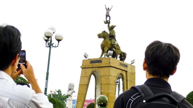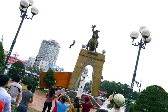 | Người đàn ông đang “múa” trên tượng đài Trần Nguyên Hãn |