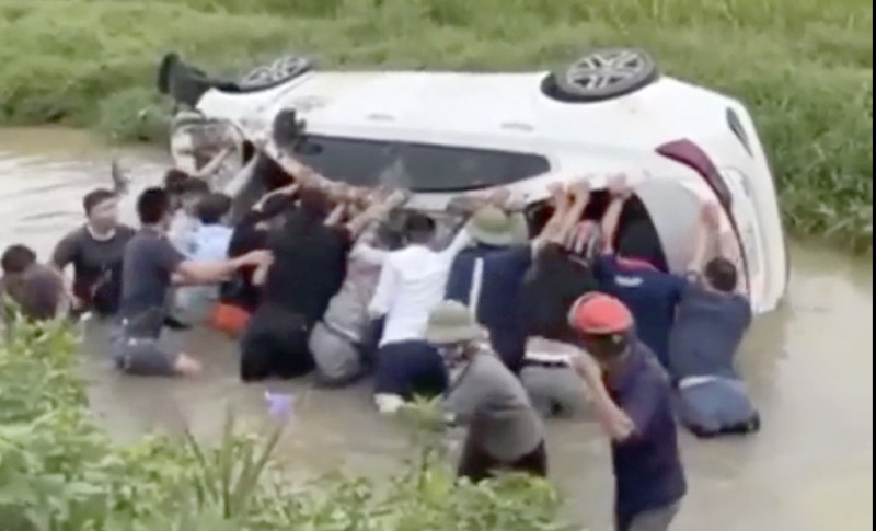 Phát hiện sự việc, khoảng 20 người dân đã nhanh chóng lội xuống mương để cùng hợp sức lật chiếc ô tô cứu nữ tài xế cùng 2 cháu bé bị mắc kẹt bên trong.