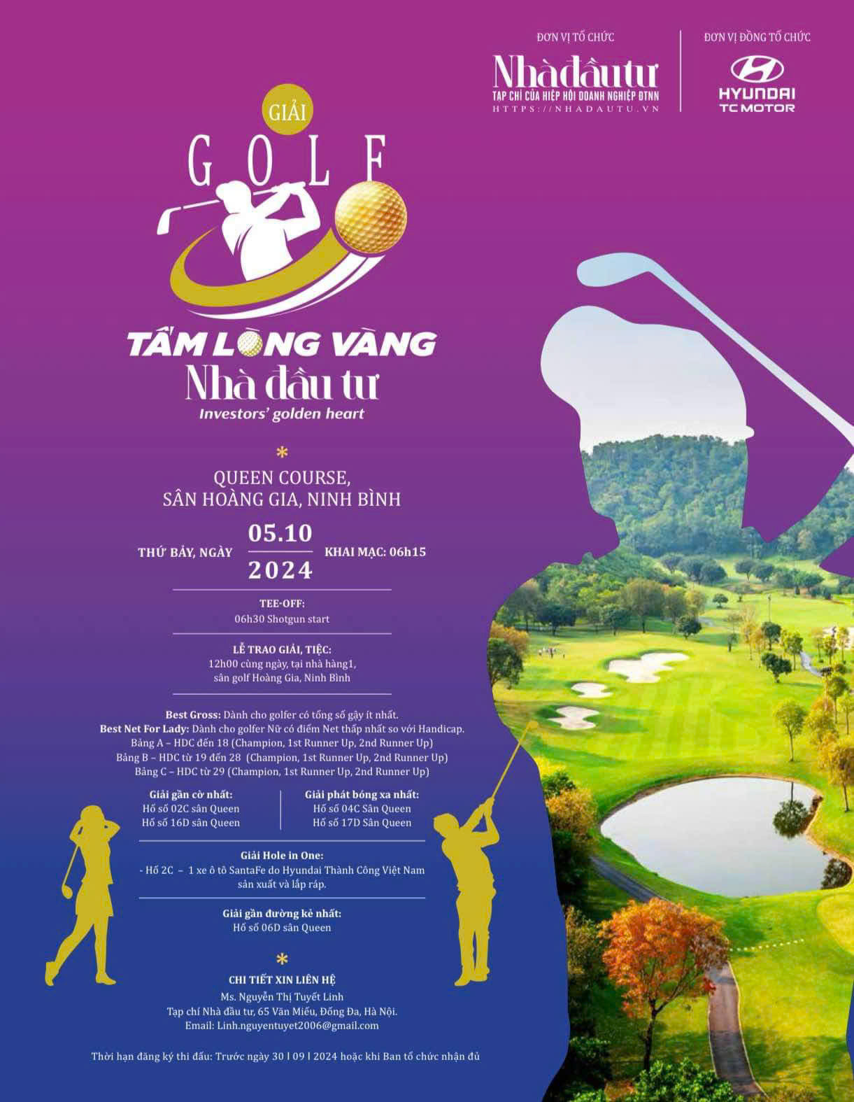 Ngày 5/10 tới, tại sân Golf Hoàng Gia (Ninh Bình), Tạp chí Nhà đầu tư phối hợp với Công ty cổ phần liên doanh ô tô Huyndai Thành Công Việt Nam tổ chức giải golf từ thiện "Tấm lòng vàng Nhà đầu tư" năm 2024.