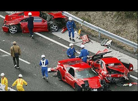 Chiếc Ferrari 512 màu trắng đâm vào đuôi Mercedes-Benz màu đen phía trước rồi lao vào rào chắn bên đường. Một chiếc F430 khác tránh được vụ tai nạn. Trong khi đó, 2 chiếc Ferrari, bao gồm F355 và F360, không may mắn như thế. Vì cố gắng tránh va chạm, chiếc F3555 tiếp theo đã đâm vào hàng rào chắn.