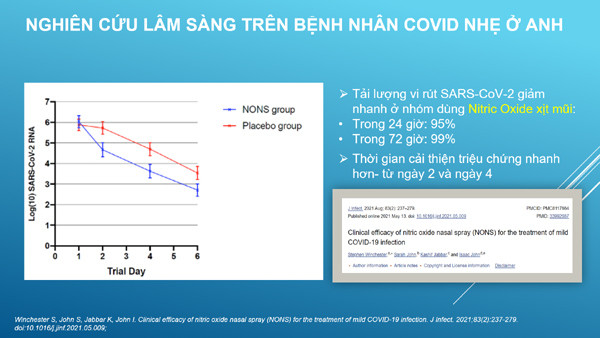 “Theo kết quả nghiên cứu lâm sàng giai đoạn 3 trên bệnh nhân Covid-19, Nitric Oxide xịt mũi giúp rút ngắn thời gian dương tính với virus. Ngoài ra, một nghiên cứu trên bệnh nhân Covid-19 vào khoa Hồi sức tích cực (ICU) cũng cho thấy, Nitric Oxide có cải thiện quá trình oxy hóa động mạch, SpO2 trung bình tăng từ 93% lên 99%”, PGS.TS.BS Lê Tiến Dũng cho biết.