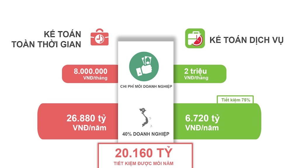 Với các doanh nghiệp nhỏ, siêu nhỏ, thay bằng việc thuê kế toán toàn thời gian, việc sử dụng các dịch vụ kế toán sẽ đơn giản và tiết kiệm hơn rất nhiều. Từ việc tiết kiệm được chi phí hàng tháng cho 40% các doanh nghiệp tại Việt Nam sẽ có thể tiết kiệm được hơn 20 nghìn tỷ đồng cho nền kinh tế Việt. Tiết kiệm chi phí sẽ đồng nghĩa với việc gia tăng lợi nhuận, thúc đẩy tăng trưởng bền vững cho nền kinh tế.