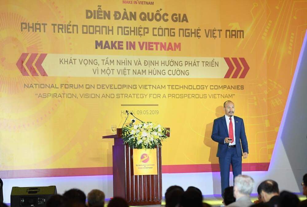 Ông Lữ Thành Long – Chủ tịch HĐQT Công ty Cổ phần MISA trình bày bài phát biểu với chủ đề “Phát triển ứng dụng công nghệ thúc đẩy tăng trưởng bền vững” tại Diễn đàn Quốc gia Phát triển doanh nghiệp công nghệ Việt Nam 2019. |