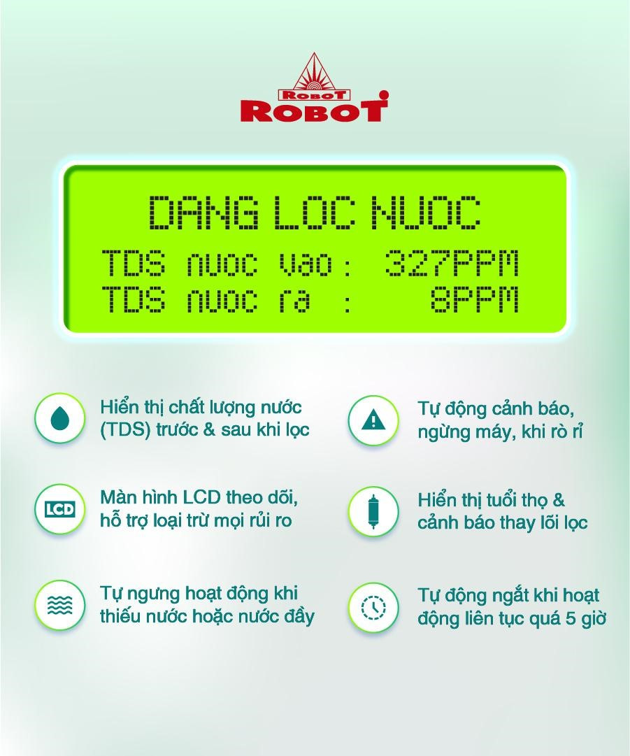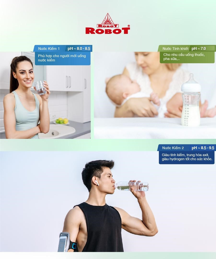 Sau quá trình tìm hiểu và nghiên cứu chuyên sâu đặc tính nguồn nước tại các vùng nông thôn, có nguồn nước giếng đặc trưng, sản phẩm của Robot được thiết kế bộ lõi lọc chức năng chuyên dụng, siêu khoáng chất và gấp đôi Hydrogen kiềm, điều chỉnh độ pH trong nước về các mức 7.0 -> 9.5. Đảm bảo các chỉ số quan trọng đánh giá chất lượng của nguồn nước Hydrogen tác dụng tốt cho sức khỏe, như: Hàm lượng Hydrogen trung bình đạt đến 800ppb; Chỉ số chống Oxy hóa ORP trung bình âm đến -400mV; Tạo 3 mức nước pH ổn định: tinh khiết pH ~ 7.0; kiềm 1 pH 8.0 – 8.5; kiềm 2 pH 8.5 - 9.5. Ngoài khả năng xử lí hiệu quả nguồn nước giếng, tạo nước ion kiềm, máy còn bổ sung các khoáng chất cần thiết cho cơ thể như Canxi, Kali...