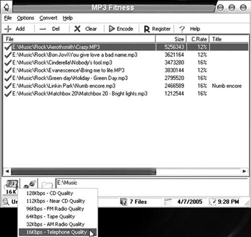 Chức năng chính của MP3Fitness là mã hoá (encode) để giảm bớt kích thước cho các file nhạc MP3 theo nhu cầu của người dùng. Bạn có thể giảm bớt kích thước cho một file MP3 xuống khoảng 2, 4 hoặc 8 lần so với kích thước ban đầu. Điều đáng chú ý là chất lượng âm thanh của file MP3 tạo ra không suy giảm bao nhiêu so với file gốc. Còn với người dùng máy tính thì MP3Fitness là liệu pháp hữu hiệu để “giảm béo” cho ổ cứng của mình. Phiên bản mới nhất MP3Fitness 2.03 có dung lượng 2,22MB, tương thích với mọi Windows, tải bản đầy đủ tại http://tinyurl.com/24jmmg.
