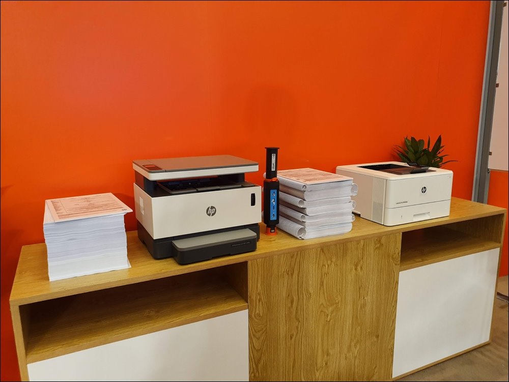 Trong nhóm máy in, HP mang đến những giải pháp: máy in HP Laser Neverstop: số lượng trang in lên đến 5.000 trang cho mỗi hộp mực, hệ thống nạp mực laser nhanh chóng giúp người dùng tự đổ mực dễ dàng chỉ trong vòng 15 giây.