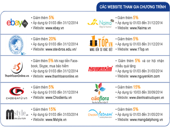 Theo chương trình, khách hàng khi mua sắm tại các website như eBay.vn, Nguyễn Kim, Naima.vn, dienhoatructuyen.vn, 1Top.vn, Chodientu.vn, mangdatphong.vn, Mystyle, Stevbros.edu.vn, Thanhtoanonline.vn… thanh toán bằng thẻ Visa phát hành tại Việt Nam qua Ví điện tử và Cổng thanh toán NgânLượng.vn sẽ có cơ hội nhận mức giảm giá tới 50% và nhiều quà tặng hấp dẫn.
