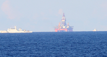 Những ngày qua, mỗi khi các tàu thực thi pháp luật của Việt Nam tiến đến giàn khoan Hải Dương 981 mà TQ đặt trái phép trên vùng biển Việt Nam, lập tức có một "phi đội" tàu TQ bao vây để cản trở, đâm, dùng vòi rồng xịt. Ảnh: Tư liệu Cảnh sát biển |