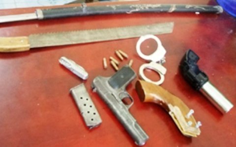 | Cảnh sát thu giữ nhiều tang vật là hung khí nguy hiểm gồm súng, mìn, dao, kiếm... |