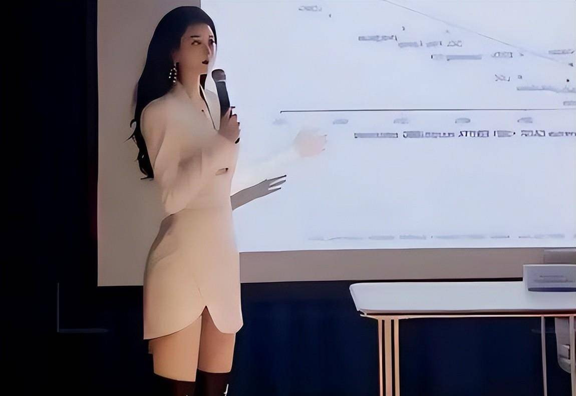 Trong bức ảnh, cô mặc váy bó màu trắng và đi bốt màu đen, khoe thân hình cực chuẩn cùng với làn da trắng và mái tóc dài xoăn nhẹ. Cô giáo xinh đẹp, trang điểm nhẹ nhàng và đang cầm micro giảng bài cho sinh viên.