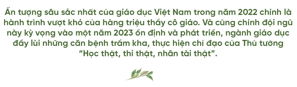 Dấn ấn của sự nghiệp giáo dục năm 2022 là các cô giáo ở Cát Bà mỗi tuần mấy lần đi đò ra các điểm đảo để dạy Tiếng Anh; là các thầy cô ở Hà Giang, Điện Biên, Lai Châu, Yên Bái… ngày nào cũng đi dạy luân phiên ở vài ba điểm trường, vượt qua vài ba mươi cây số đường rừng đèo dốc…