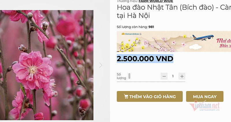 Tại TP.HCM, khách hàng có thể đặt mua đào Nhật Tân từ sàn thương mại điện tử, giao hàng tận nơi, tối đa 2 giờ sau khi đặt với giá 2,8 triệu đồng/cành.