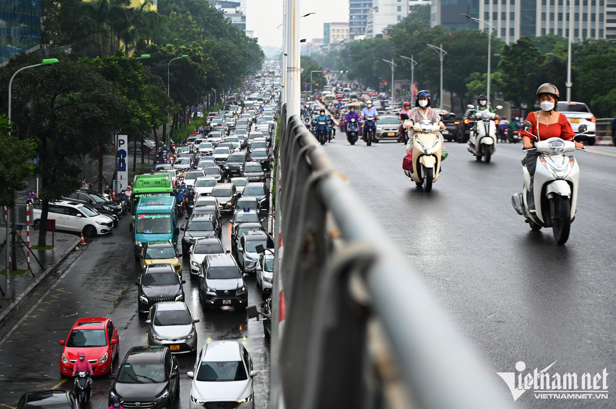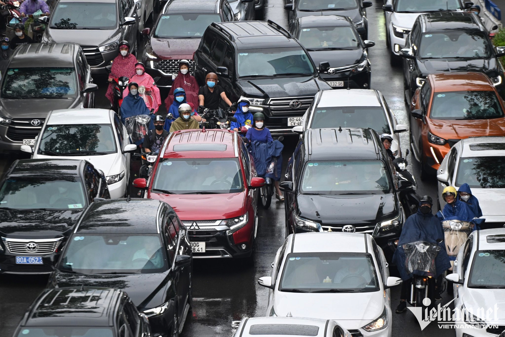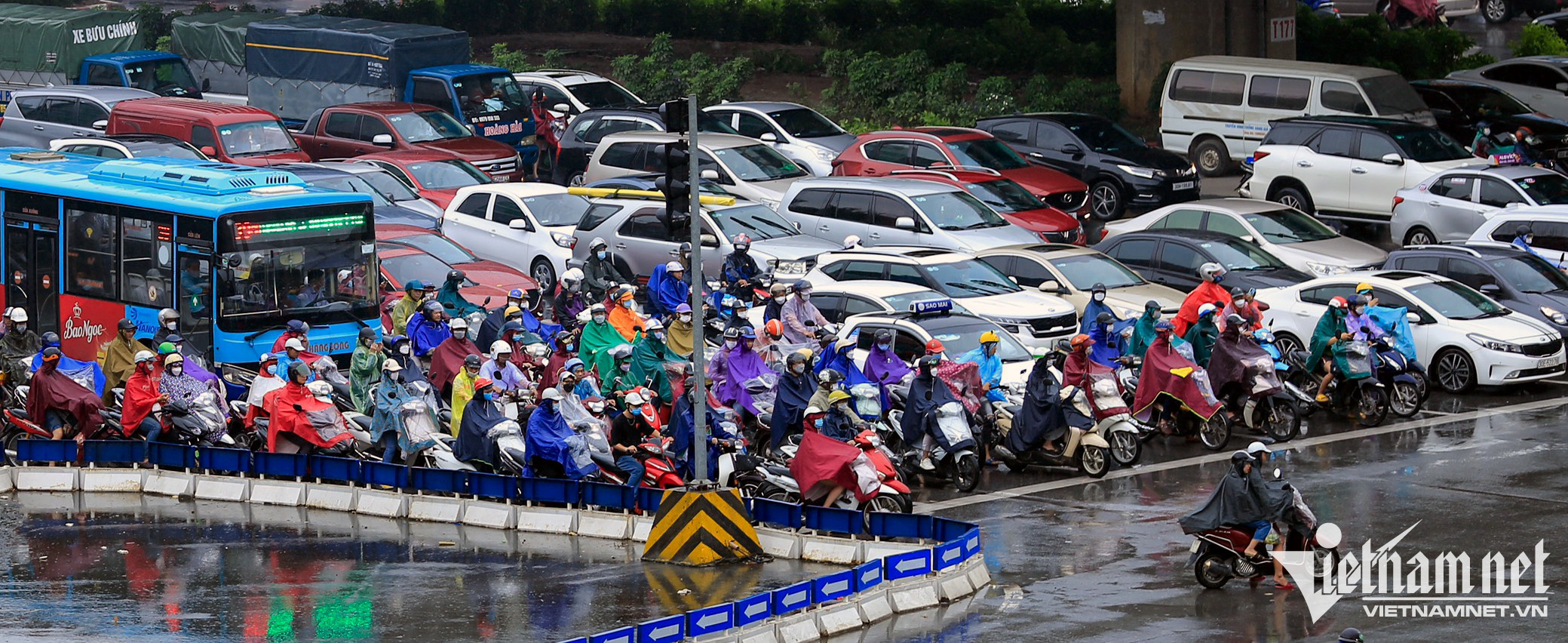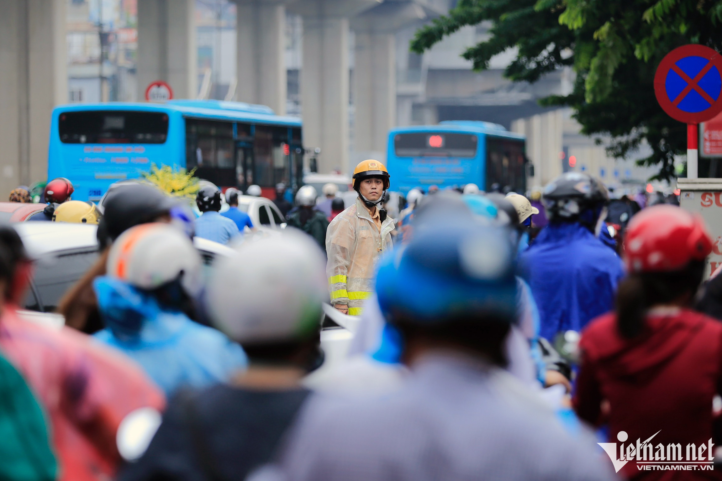 Mặc dù mưa nhỏ, nhiều tuyến đường ở thủ đô vẫn bị rối loạn, lượng ôtô đổ ra đường quá lớn lấn hết cả làn dành cho xe máy. Một cảnh sát gặp khó khi điều tiết, chỉ còn biết đứng nhìn các phương tiện ùn ùn chen lấn.