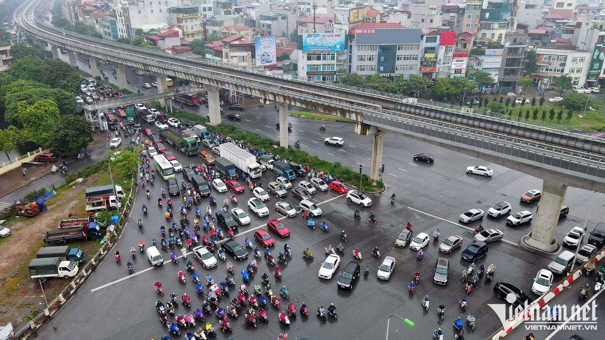 Xe cộ ùn ùn "bò" lên dốc cầu vượt Nguyễn Chánh - Hoàng Đạo Thuý lúc 7h.Lúc 8h30, tình hình giao thông tại nút giao Hồ Tùng Mậu - Phạm Văn Đồng đã được cải thiện.