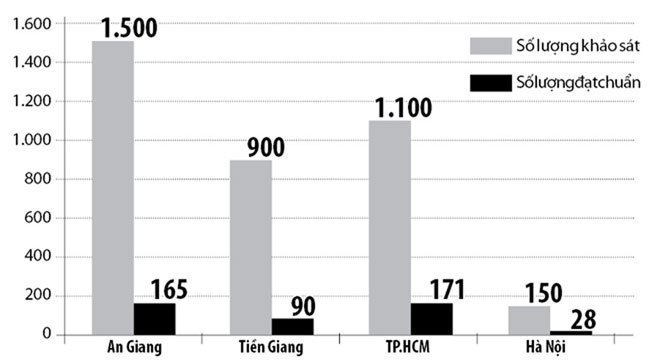 Kết quả khảo sát của An Giang cũng chẳng khá khẩm gì hơn. Tổng số giáo viên các cấp tham gia khảo sát là 1.500 người. Tính theo tỉ lệ thì bậc THPT có 17,8% đạt chuẩn, bậc THCS có 10% đạt và thấp nhất là bậc tiểu học với chỉ khoảng 5%. Nếu tính ra số lượng từ tỉ lệ này, chỉ có 165 giáo viên đạt chuẩn.