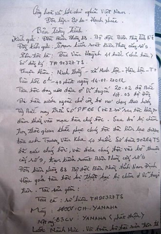 | Bản tường trình của chủ tàu và xác minh vụ việc của đồn biên phòng Quất Lâm (88), Biên phòng tỉnh Nam Định. |
