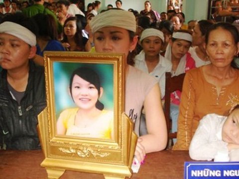 | Gia đình nạn nhân đem di ảnh, chít khăn tang đến dự phiên tòa |
